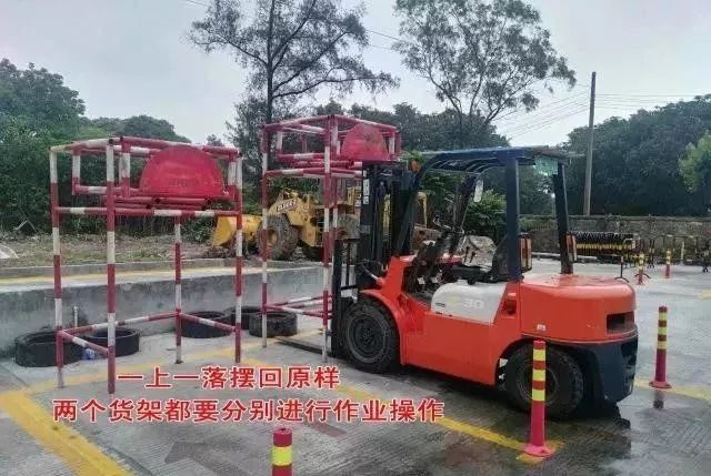 作業(yè):乙?guī)斓呢浖埽ǜ叩哪莻€(gè))入叉叉貨以后倒車直接升到頂(油缸提升的時(shí)候要加油提速,不要怠速提升),放下后稍微停一下,馬上又提升放回下層,然后倒車入丁庫,入庫時(shí)只要求整車身入庫,入庫后,貨叉要放到地,不然要扣分。丙庫的貨架一樣的操作,貨架放地上以后,倒車回甲庫起點(diǎn),貨叉也要入庫,謹(jǐn)記貨叉要后傾并提升至離地20-40cm。