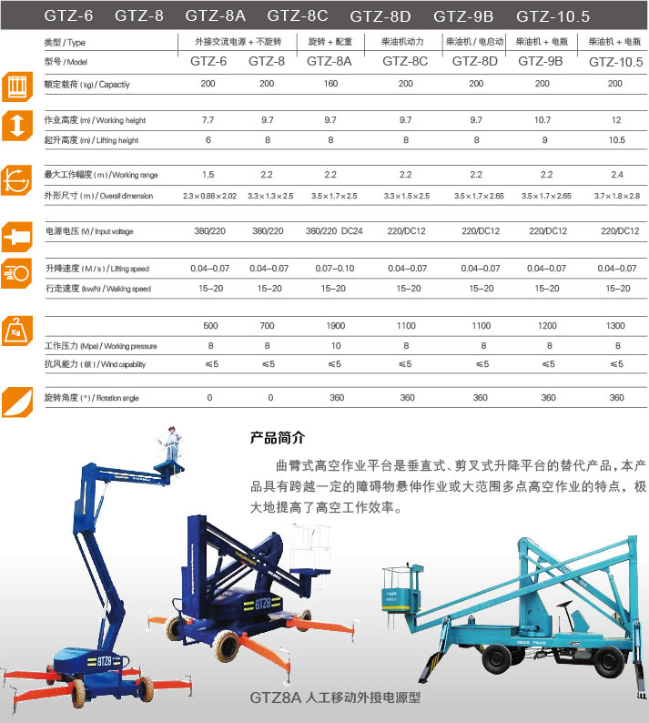 曲臂式高空作業(yè)平臺是垂直式、剪叉式升降平臺的替代品,本產(chǎn)品具有跨越一定的障礙物懸伸作業(yè)或大范圍多點高空作業(yè)的特點,極大地提高了高空工作效率。
